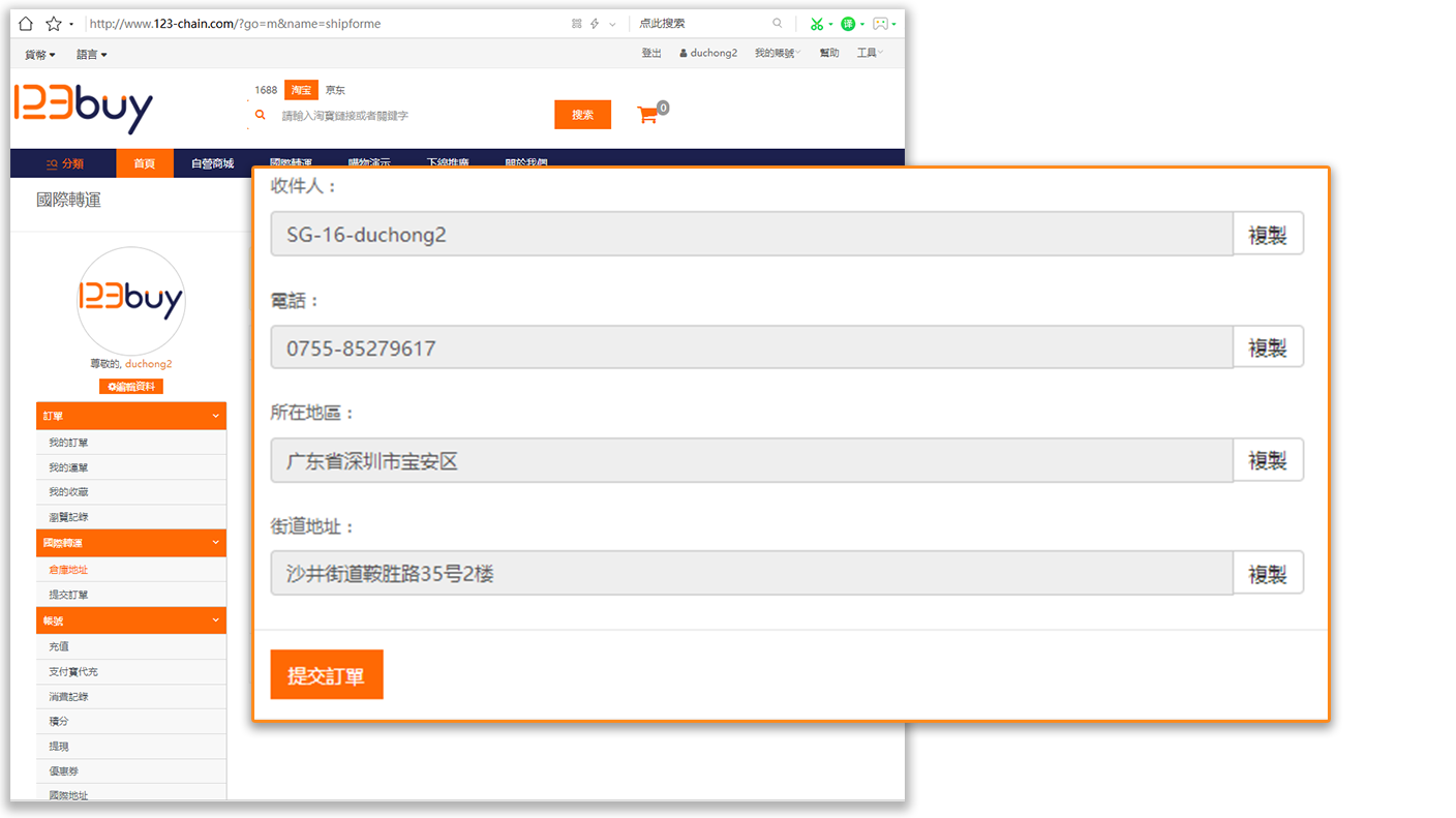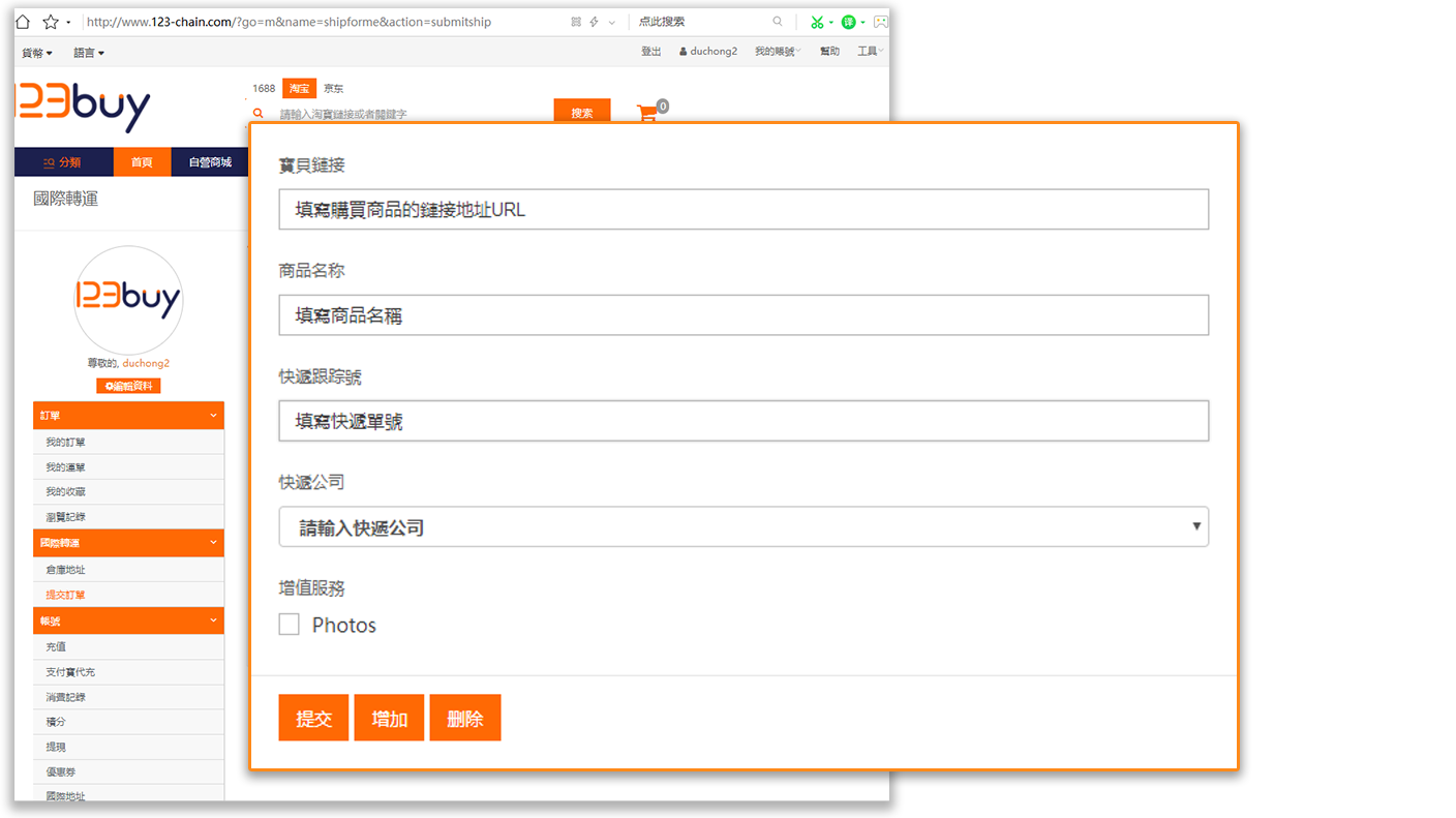 或者通过国际转运填写商品信息直接提交订单到jiyunmao平台会;员登陆后在 ‘会员中心’ → ‘国际转运’ → ‘仓创库地址’中 获取转运地址(此地址信息为您在淘宝、京东等电商平台下单时填写的收件地址信息)然后提交订单点提交后在jiyunmao平台填写您购买的商品信息后提交即可!