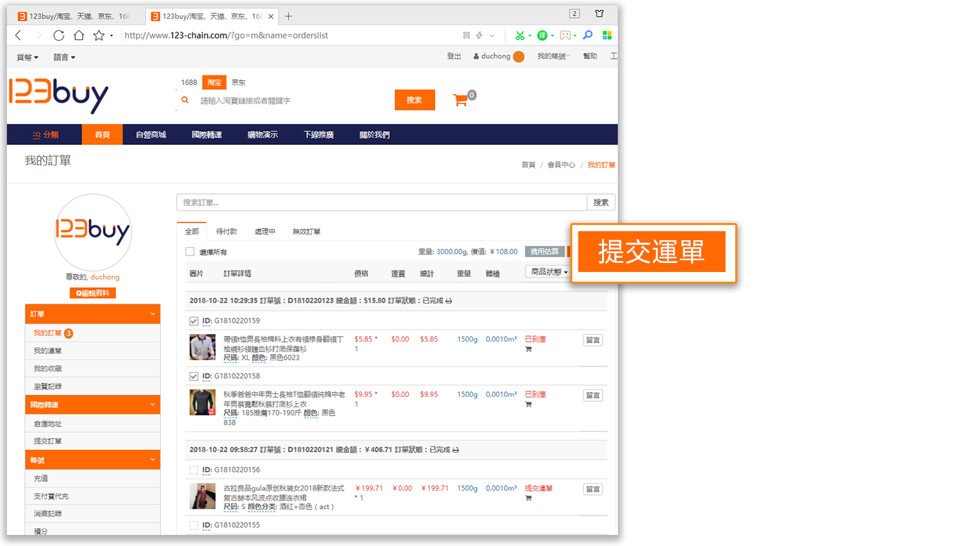 入库后您可以选择您要寄送到海外的包裹信息并提交运单;或者继续购买商品入库后一起提交寄送到海外!